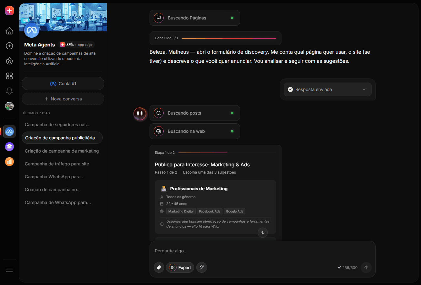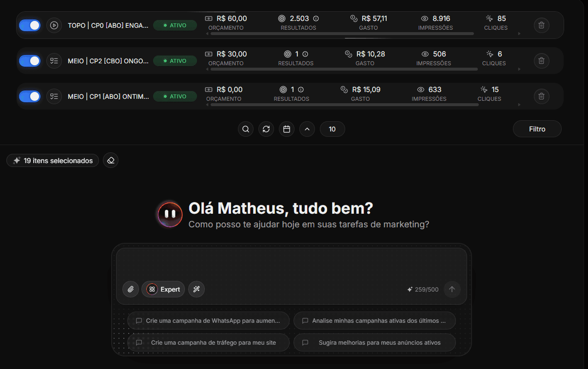 Em poucas mensagens os agentes de I.A criam sua campanhas direto no Meta Ads sem que você precise ter conhecimento em Marketing Digital!