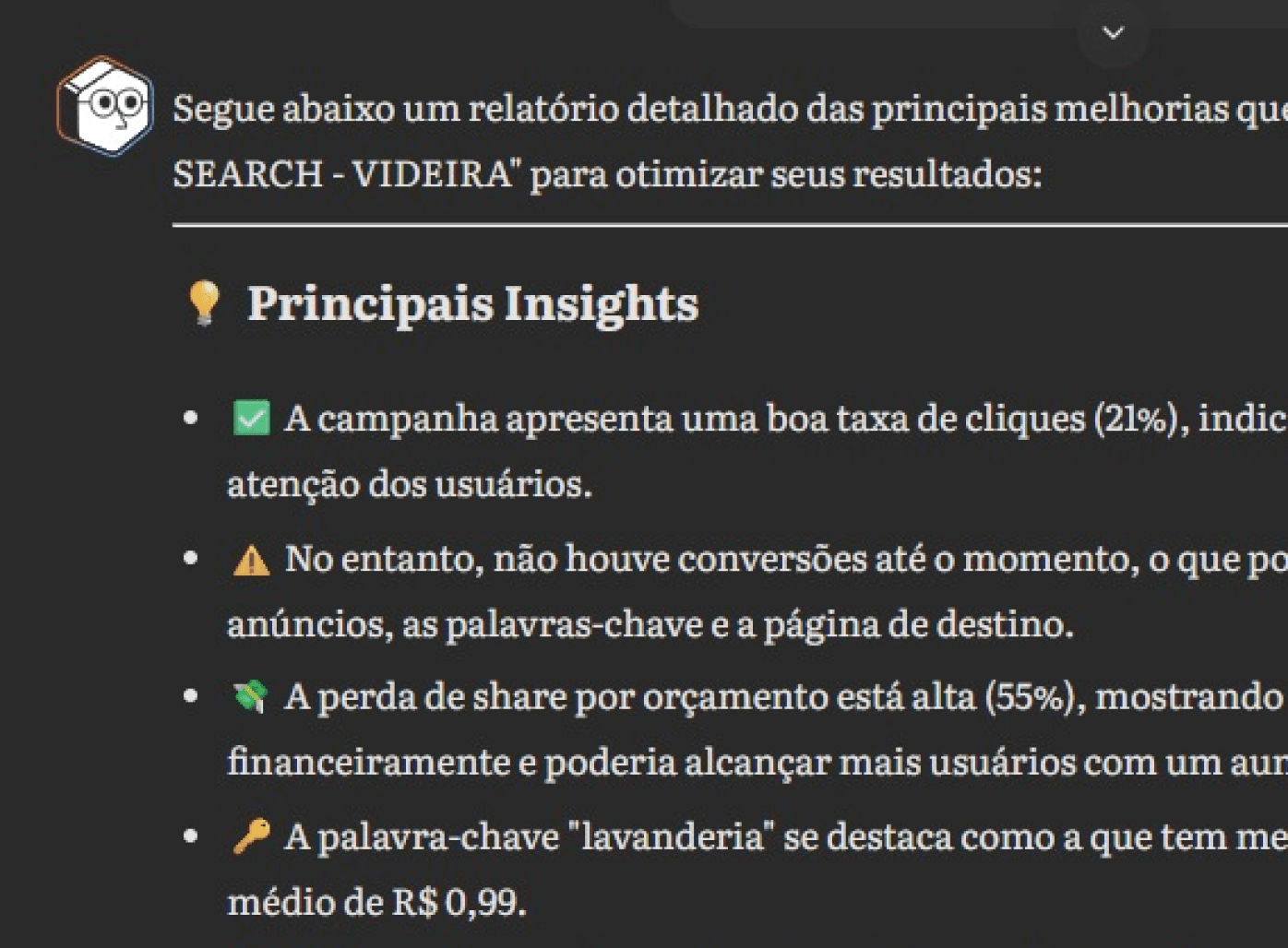 Com poucos cliques receba um relatório detalhado dos principais insights de suas campanhas e as principais melhorias.