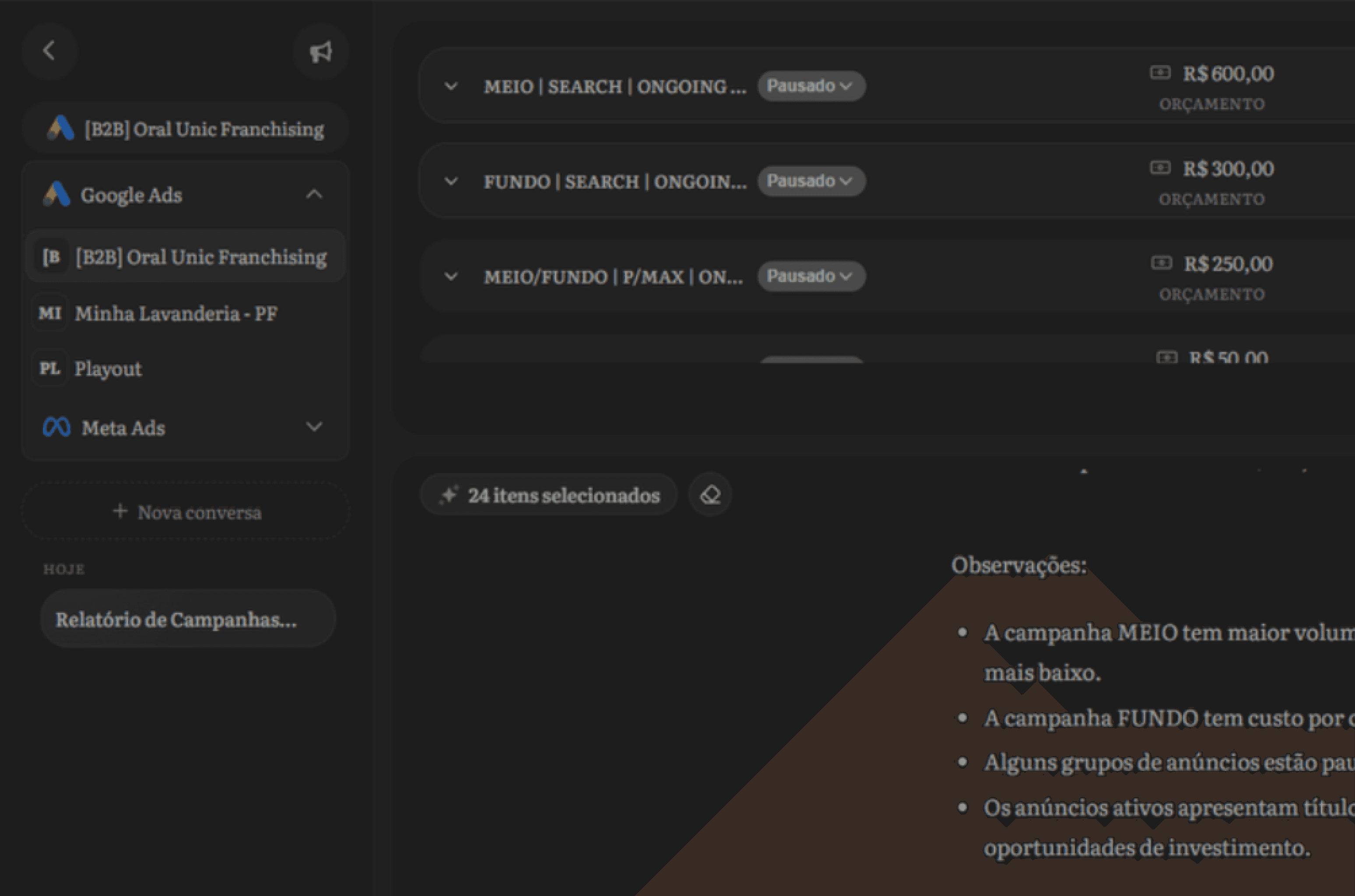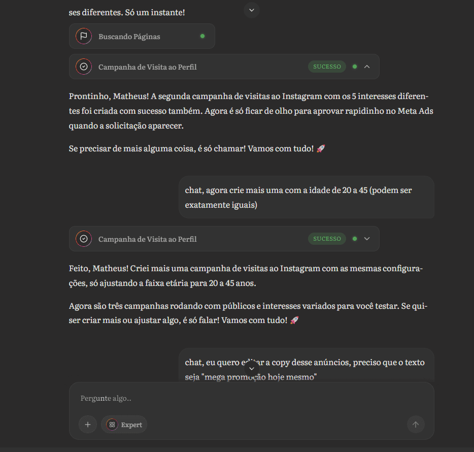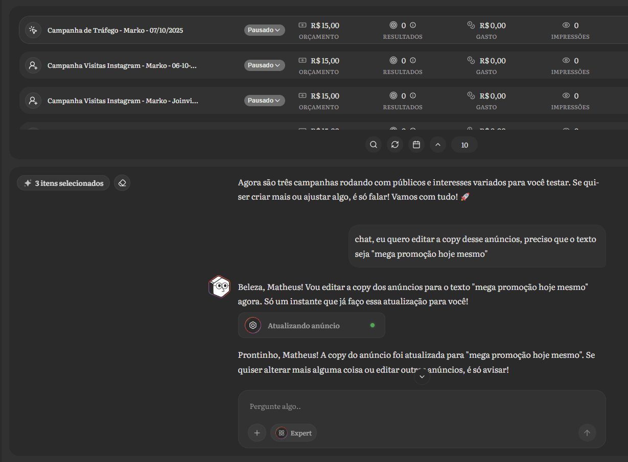 Basta selecionar as campanhas desejadas e pedir suas alterações que a Wilo faz o trabalho, altere públicos, orçamentos, anúncios tudo isso pronto em poucos segundos.